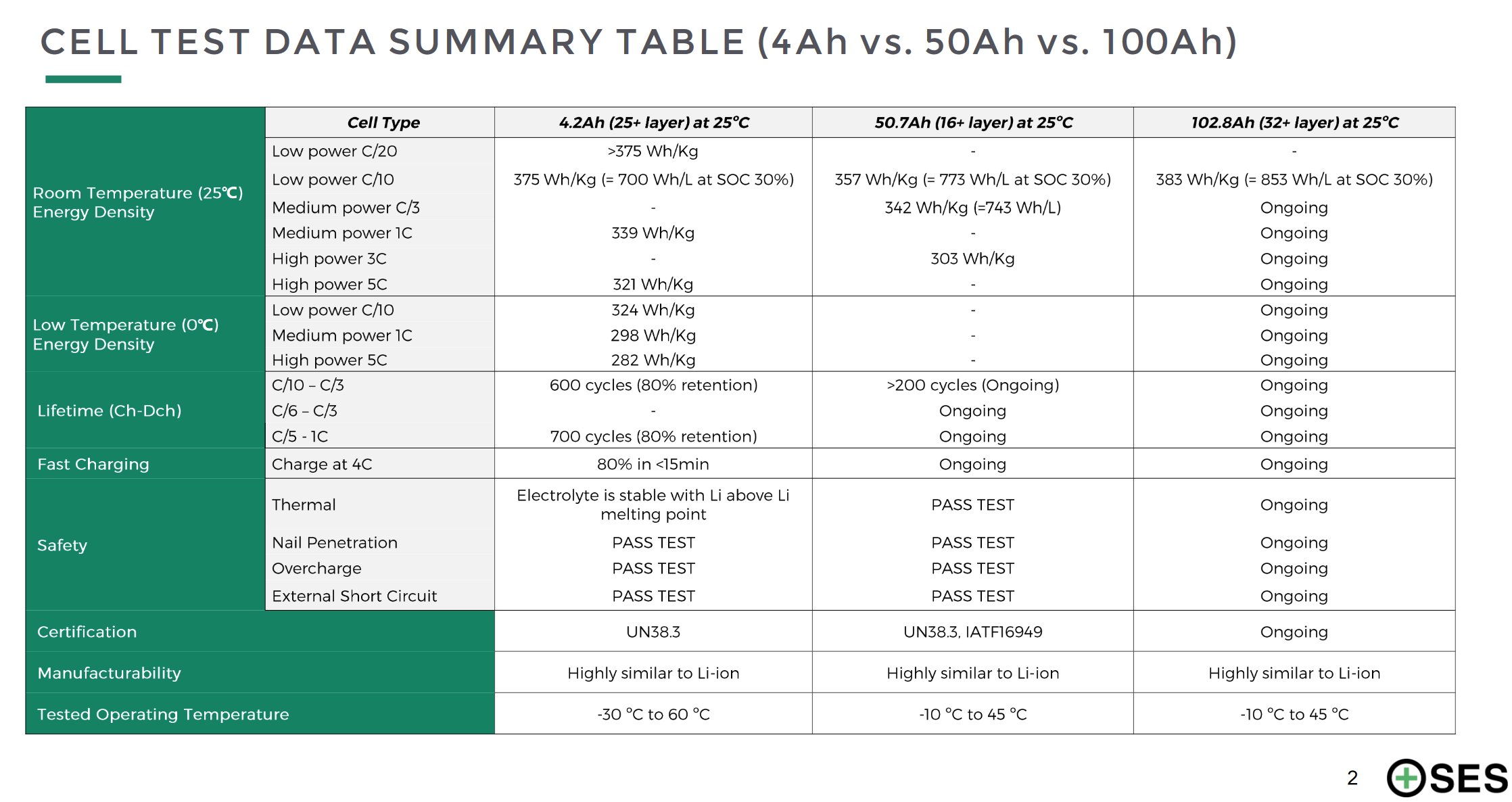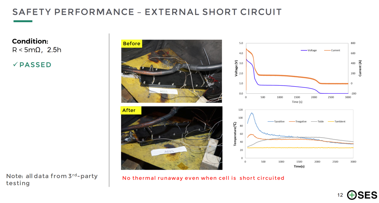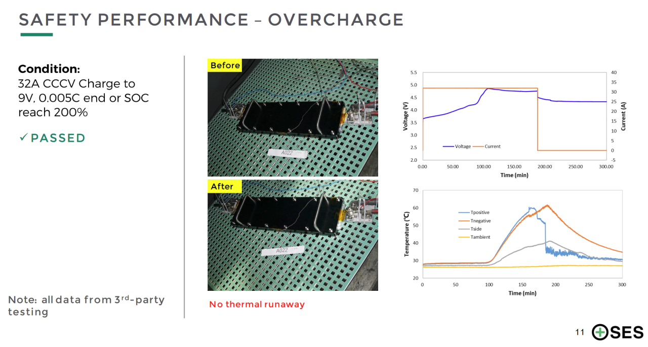 报告信息显示,SES目前105.8Ah锂金属电芯已通过了第三方测试机构的过充、针刺、外短路和热稳定测试,并获得UN38.3认证。